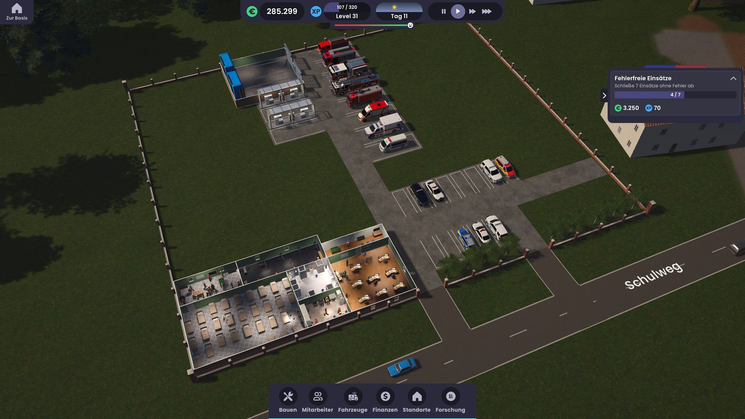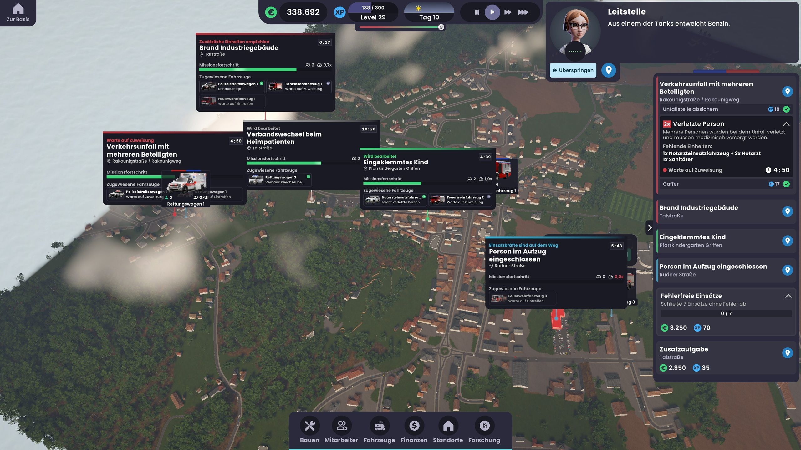 In weiterer Folge müssen wir natürlich auch genug Beamte einstellen, damit wir die unterschiedlichen Notfälle bearbeiten können. Enorm wichtig ist auch die Anzahl der Einsatzfahrzeuge. Was helfen genügend Angestellte, wenn sie nicht aus der Basis fahren können? Die Fahrzeuge sind dann auch die teuersten Anschaffungen im Spiel also immer schön sparen. Im Technologiebaum könnt ihr zusätzliche Fahrzeuge freischalten und auch ein paar passive Boni. So müsst ihr beispielsweise eure Fahrzeuge nicht mehr manuell tanken und waschen, sondern das wird automatisch von der Besatzung erledigt. Heißt um eure Basis baut ihr Tankstellen und Waschmöglichkeiten sowie genügend Parkplätze für eure Einsatzfahrzeuge.