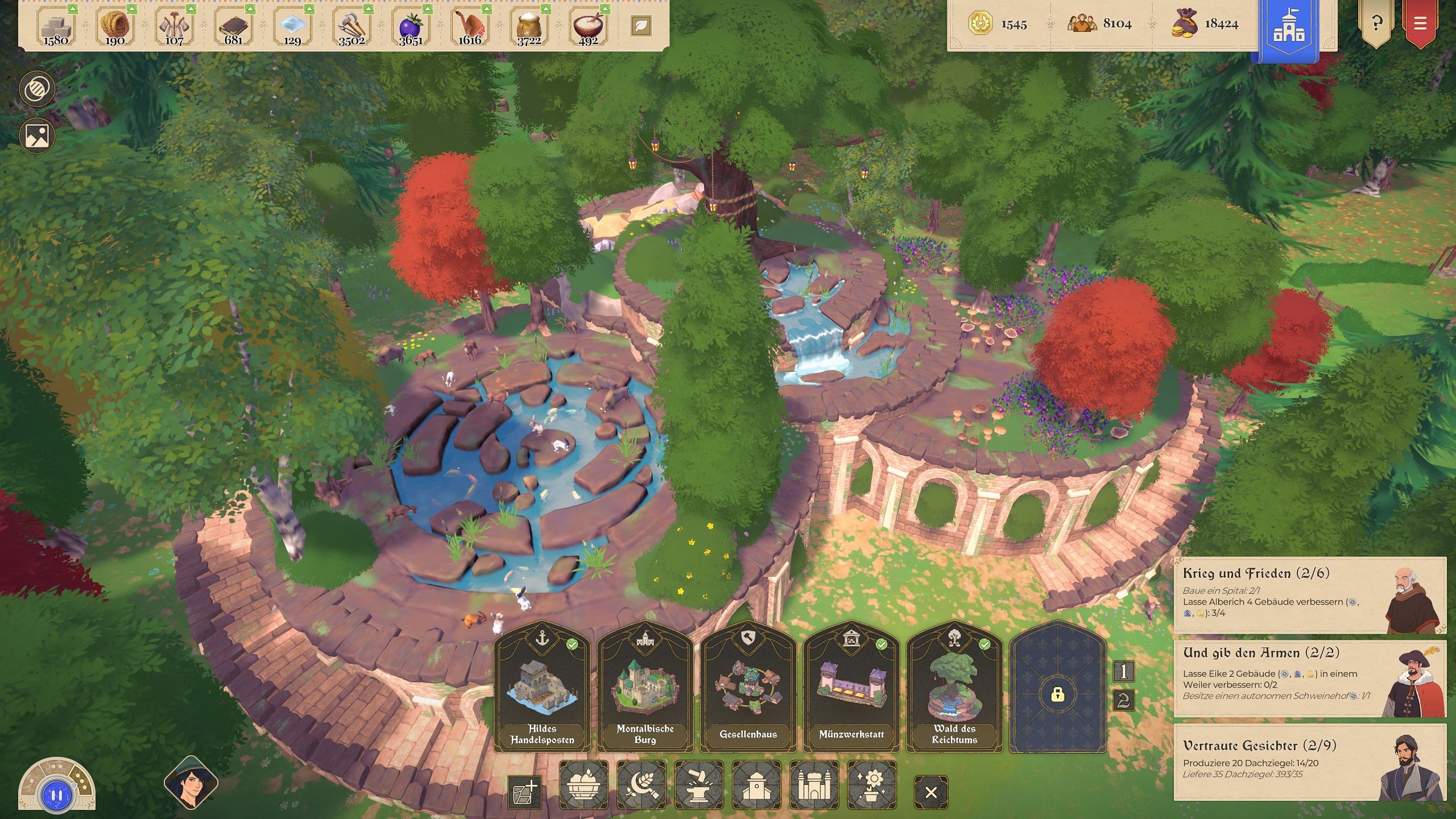 Insgesamt könnt ihr euch währenddessen elf Charaktere sichern, die für euch in euren Produktionsstätten arbeiten. Diese elf Menschen versorgen euch jeweils mit fünf zusätzlichen Nebenaufgaben. Der Lohn der Mühen sind spezielle Gebäude die unsere Reichweite in Form von notwendigen (Unterhaltungs-)-Einrichtungen erhöhen.