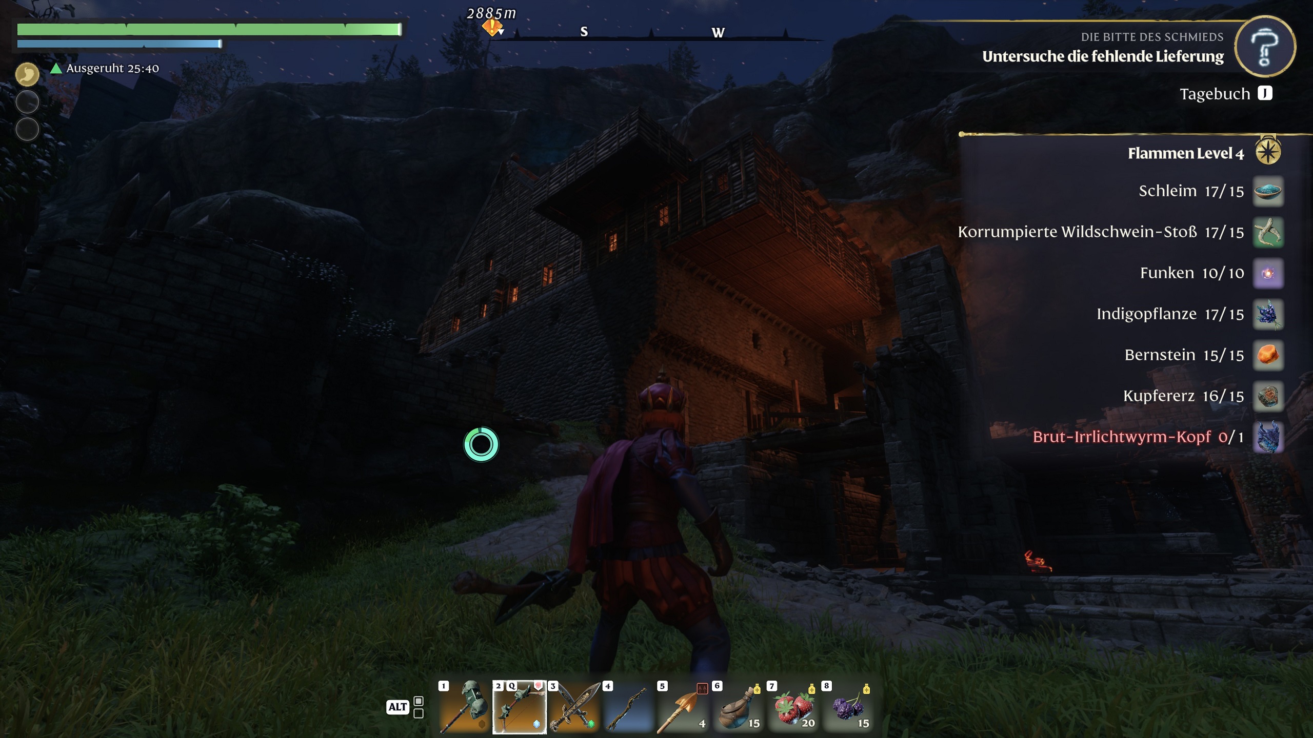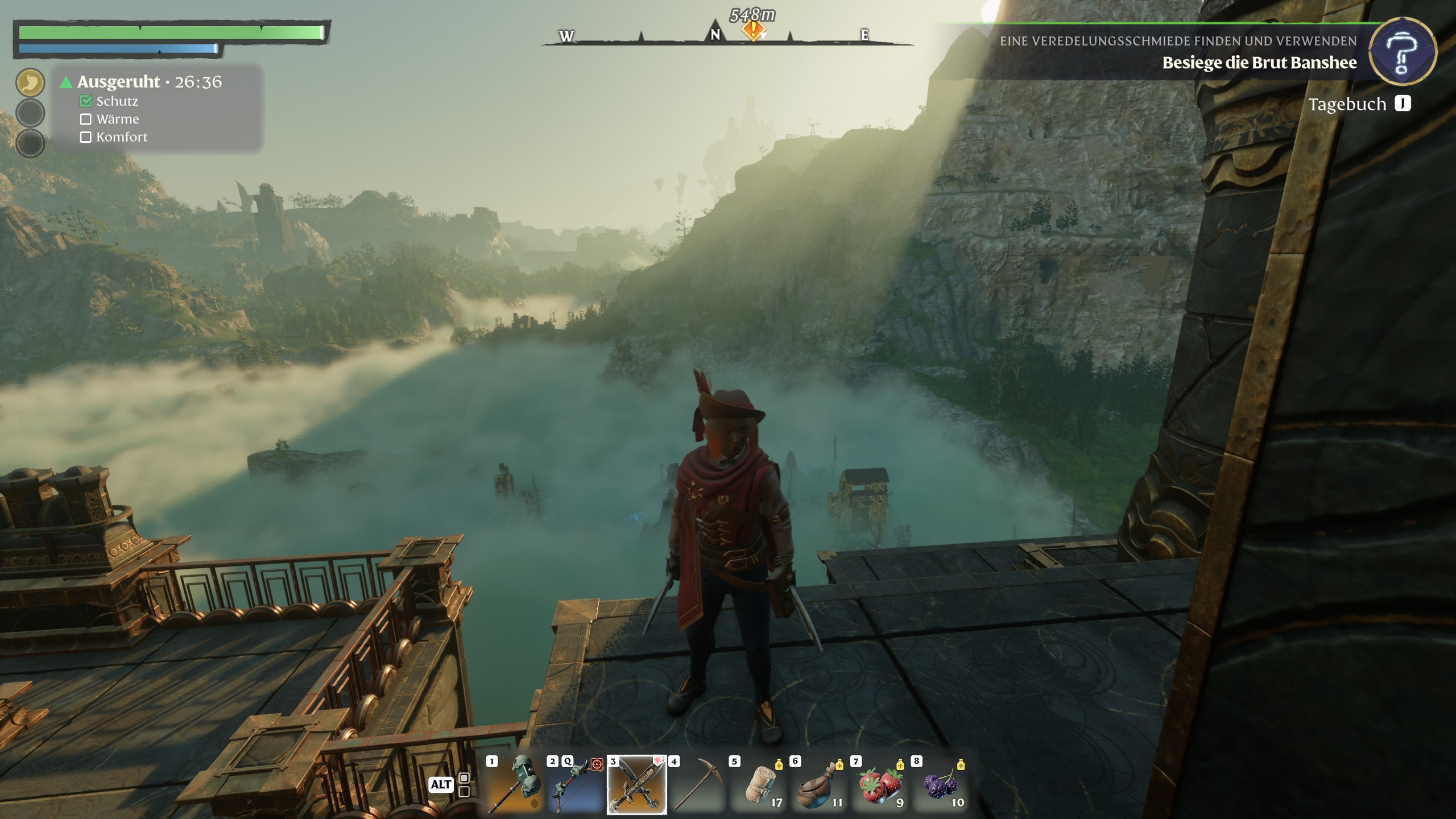 Der Titel setzt euch aber künstliche Grenzen. Neben normal begehbaren Gebieten gibt es auch tieferliegende Biome in denen ein ekelhafter Nebel, genannt Miasma, vorherrscht. Den grauen Schleier könnt ihr ganz normal betreten und darin Ressourcen farmen, Gegner erledigen und so weiter. Glüht der Nebel rot, sagt euch Enshrouded damit, hier habt ihr noch nichts verloren. Ihr müsst nun das Herz eurer Basis hochleveln und erhalten anschließend, nach und nach Zugriff auf weitere Gebiete. Oft ist es auch notwendig, da wir sonst weiterführende Quests nicht erledigen können.