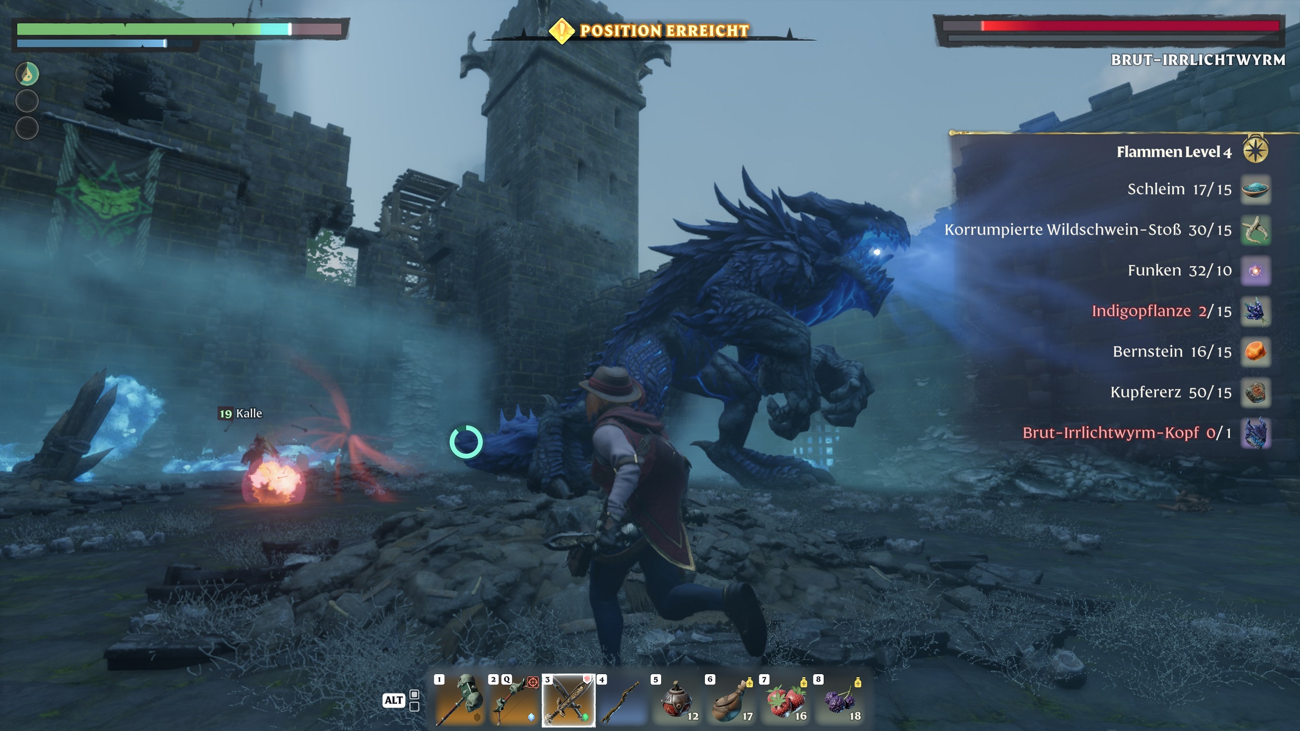 Hier befinden sie Miss Eve und Kalle in einem Bosskampf. Wir benötigen den Kopf des Ungeheuers, damit wir unser Basisherz aufwerten können - Enshrouded.