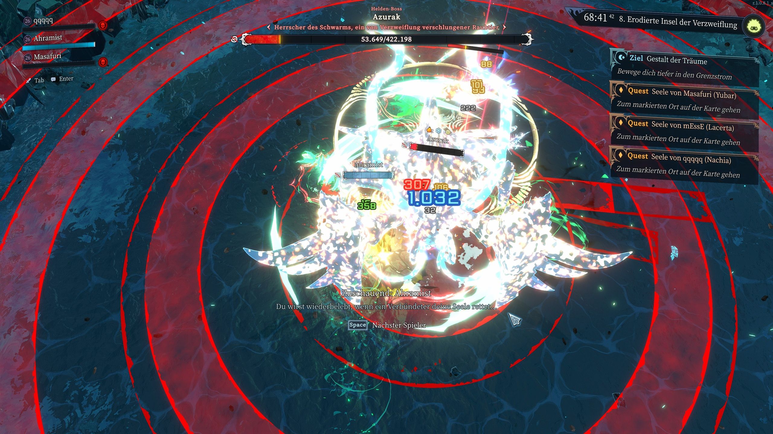 Die Kämpfe an sich sind unheimlich schnell, fordernd und abwechslungsreich und werden in abgeteilten Arenen abgehalten. Besonders bei größeren Mobgruppen die mit Bossen garniert sind, heißt es hellwach zu sein. Im Grunde genommen gilt: Ausweichen, Überleben und erst danach folgt der Schaden. Besonders bei den riesigen Bosskämpfen gilt diese Regel. Die Bosse verfügen über unterschiedliche Phasen und Angriffsmuster, das erinnert an MMORPGs. Unsterblich ist nämlich niemand, Übermut geht ganz schnell nach hinten los. Zum Glück können gefallene Spieler an speziellen Punkten wiederbelebt werden. Die noch lebenden Helden müssen sich aber erst dorthin durchkämpfen.