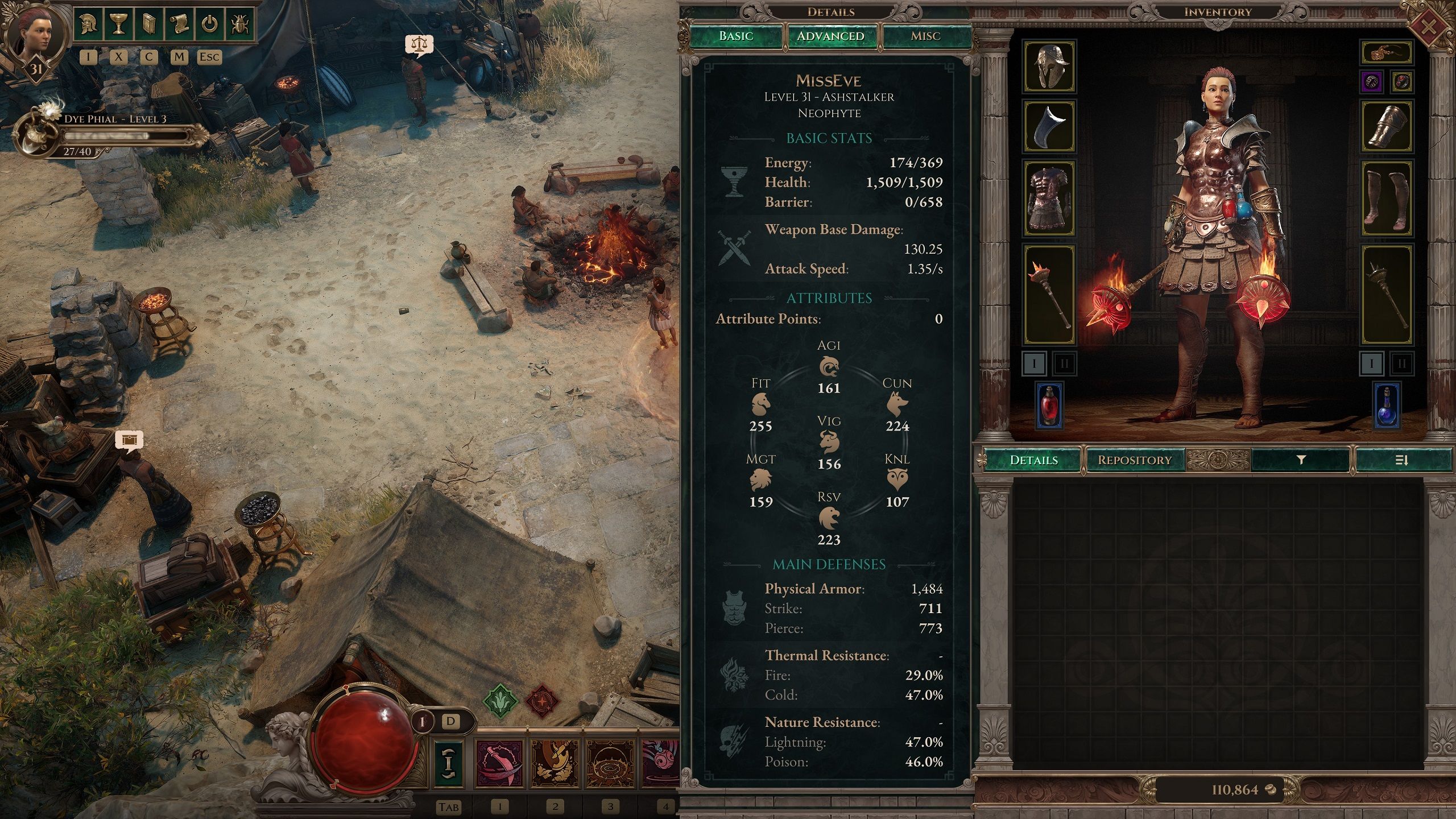 Hier seht ihr den Charakterbildschirm von Titan Quest 2. Da wir Feuerauren verwenden, sehen unsere Waffen so feurig, sexy aus.