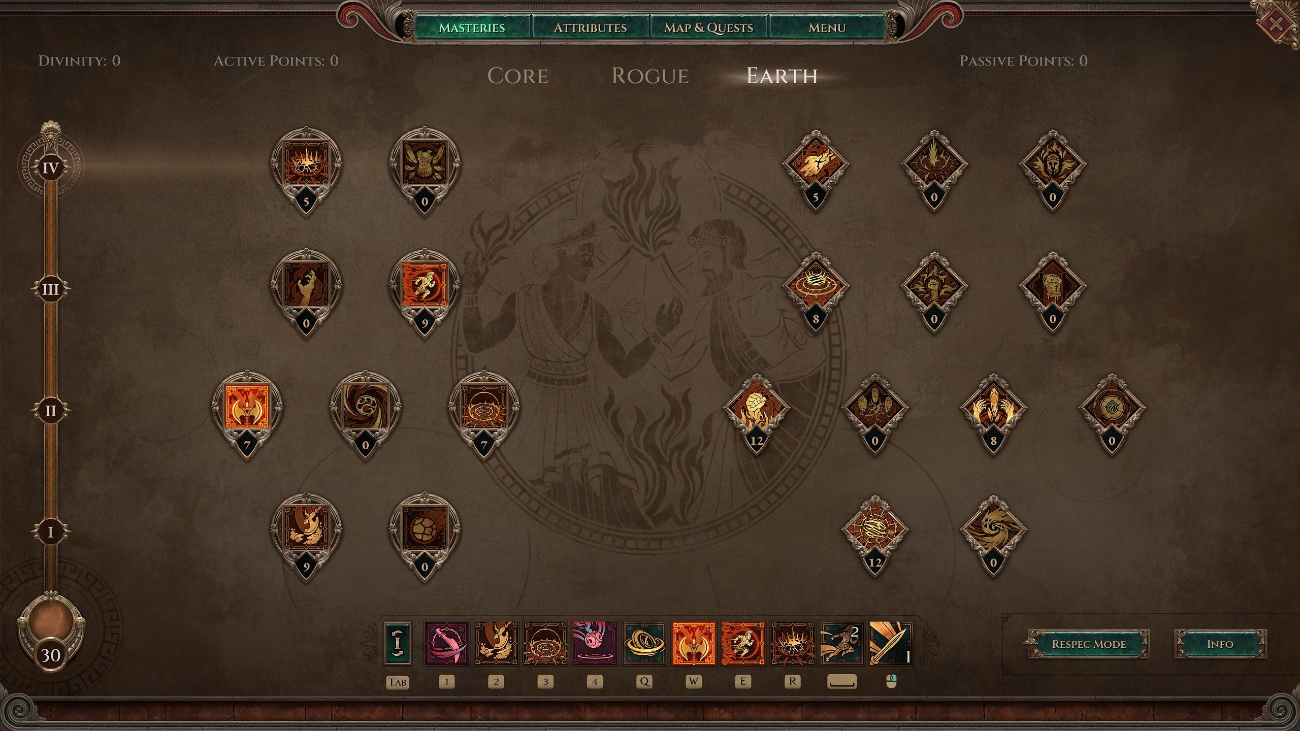 Wohin sich Miss Eve entwickelt, haben komplett wir in der Hand. Neben dem Standardangriff verfügt auch jeder Charakter über ein aktivierbares Schild. Aktuell gibt es in Titan Quest 2 vier Optionen: „Earth“, „Rogue“, „Storm“ und „Warfare“. Wir haben uns dabei für einen erdgebundenen Assassinen entschieden.