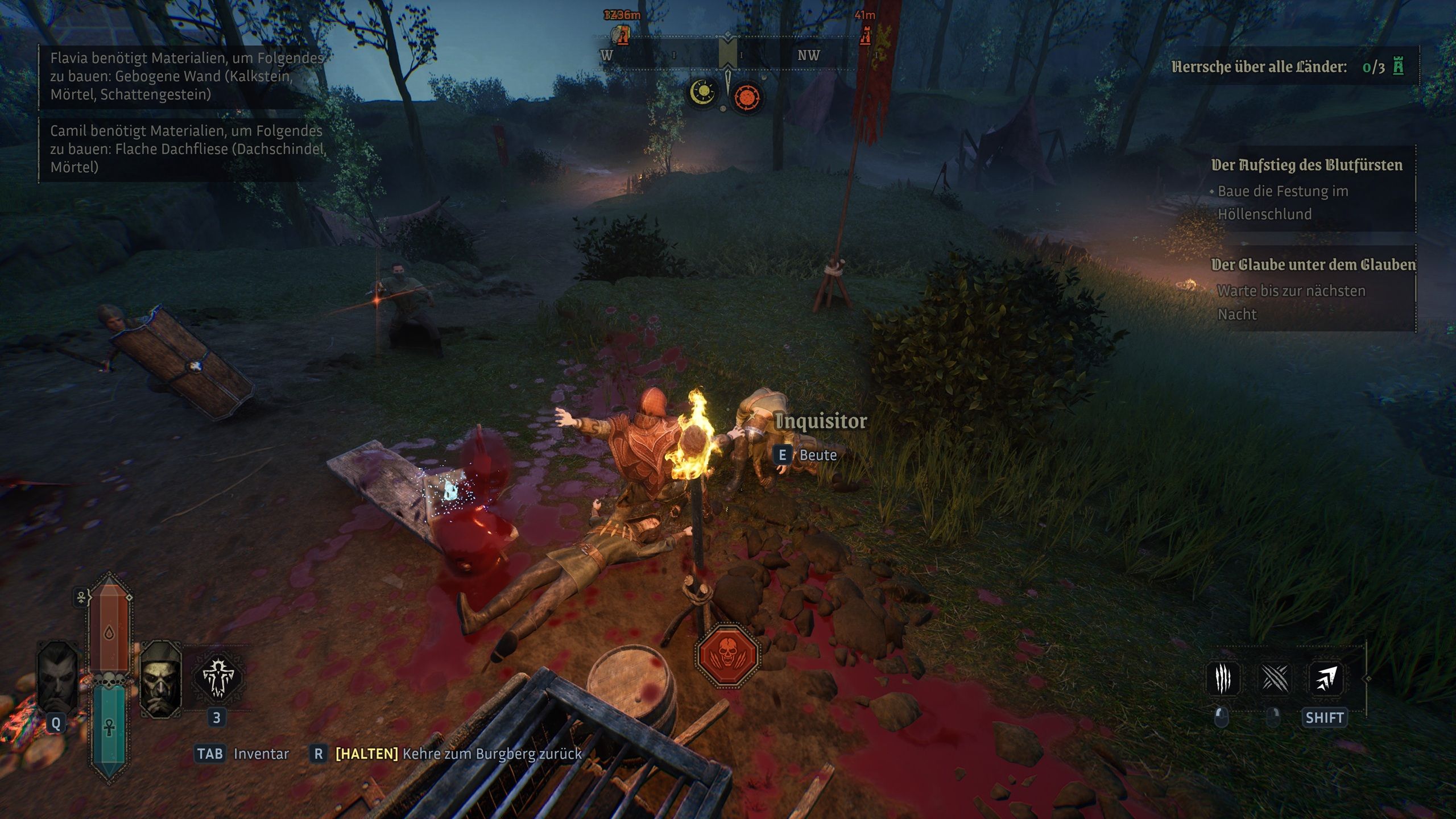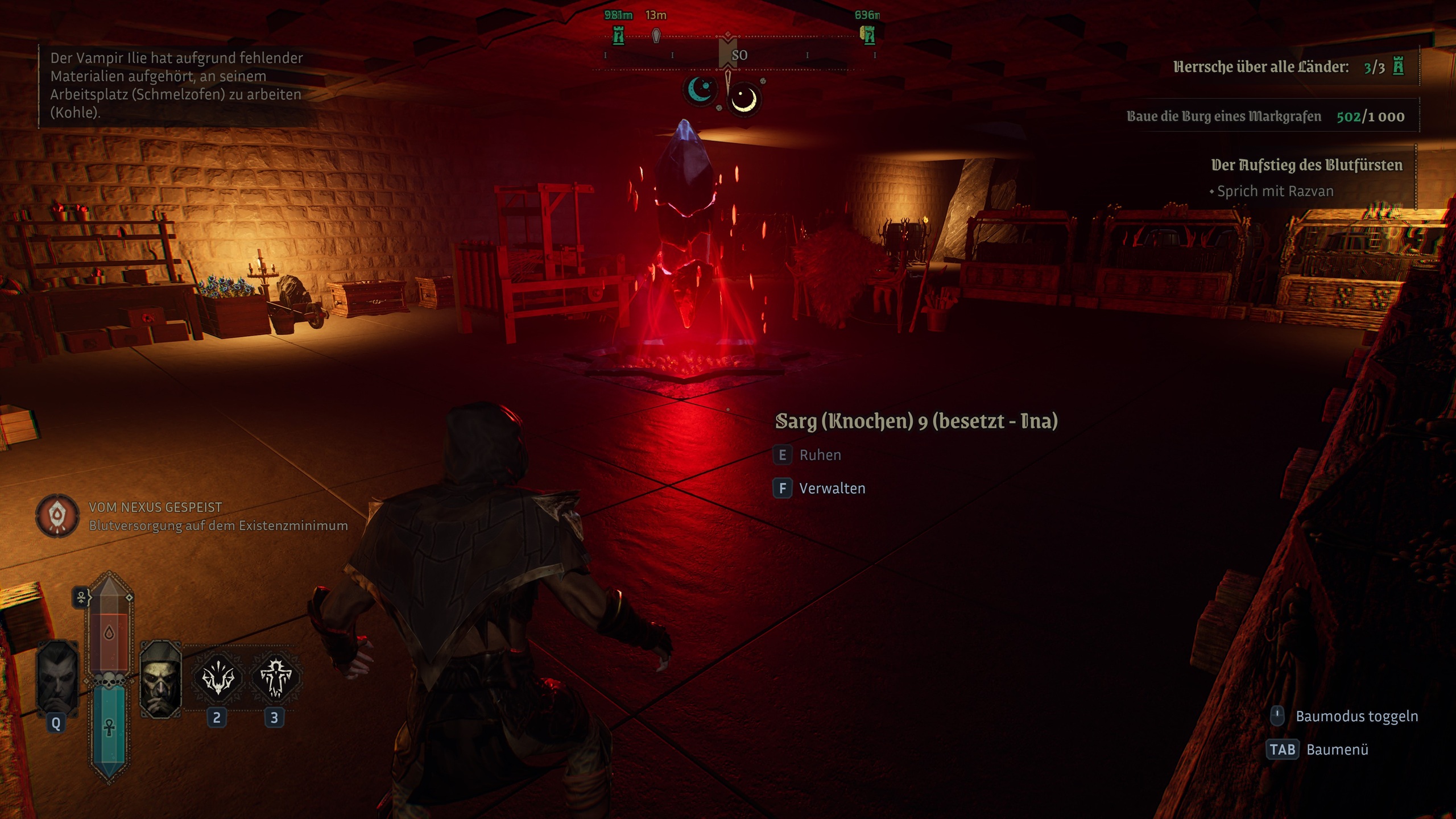 Neben unserer eigenen Burg, die wir nicht frei in der Spielwelt bauen dürfen, ist es unsere Aufgabe in Vampires: Bloodlord Rising, drei weitere Burgen zu errichten. Das können wir ebenfalls unsere Diener erledigen lassen. Da dieser Vorgang aber arg lang dauert, haben wir manuell eingegriffen und zusätzlich Ressourcen gefarmt und weiterverarbeitet. Leider lassen sich nicht alle Ressourcen zügig abbauen da es nicht viele Abbauplätze dafür gibt.